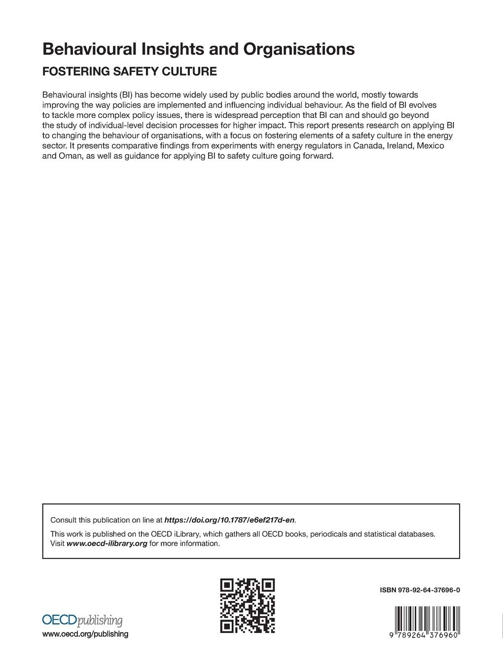 Behavioural insights (BI) has become widely used by public bodies around the world, mostly towards improving the way policies are implemented and influencing individual behaviour. As the field of BI evolves to tackle more complex policy issues, there is widespread perception that BI can and should go beyond the study of individual-level decision processes for higher impact. This report presents research on applying BI to changing the behaviour of organisations, with a focus on fostering elements of a safety culture in the energy sector. It presents comparative findings from experiments with energy regulators in Canada, Ireland, Mexico and Oman, as well as guidance for applying BI to safety culture going forward.